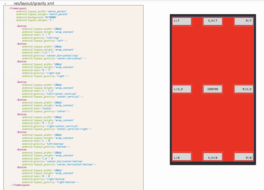 | 겉(내용물 위치) : gravity, 속(부모 뷰): layout_gravity |