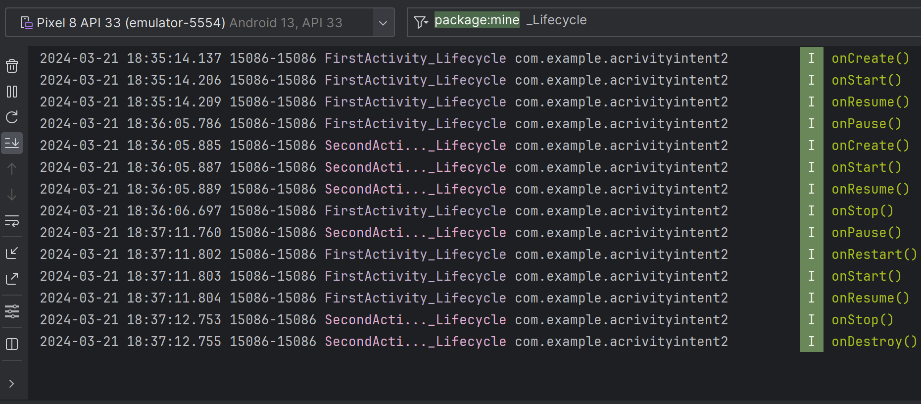 (2) SecondActivit의 onCreate() -> onStart() -> onResume()